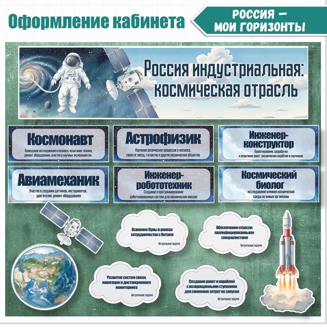 Россия – мои горизонты. «Россия индустриальная: космическая отрасль». Оформление. Материал предназначен для наглядного представления информации на уроке внеурочной деятельности «Россия – мои горизонты» по теме «Россия индустриальная: космическая отрасль». В комплекте: Всего к печати 11 страниц. Скачать материал с подпиской маркетплейса Инфоурок можно по ссылке: https://infourok.ru/magazin-materialov/rossiya-moi-gorizonty-rossiya-industrialnaya-kosmicheskaya-otrasl-oformlenie-1456232