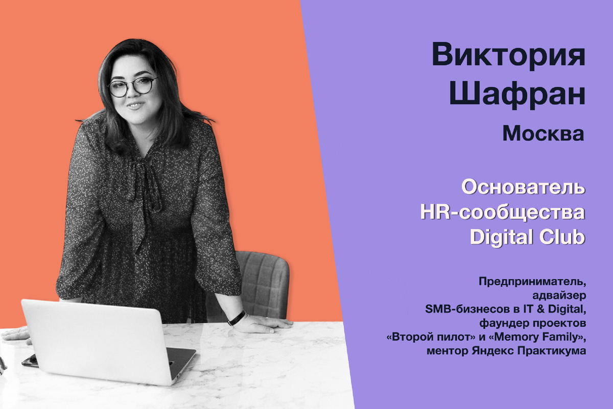 Сегодня наша гостья – Виктория Шафран. Виктория – предприниматель, основатель HR-сообщества DC, адвайзер SMB-бизнесов в IT & Digital, фаундер проектов «Второй пилот» и «Memory Family», а также ментор Яндекс Практикума.