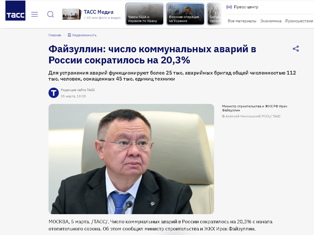 Люди за эту ветошь взялись серьёзные. Они сначала стройку довели до офигительного состояния, более лучшие результаты (что очевидно) покажут в ЖКХ. ТАСС Число коммунальных аварий в России сократилось на 20,3% с начала отопительного сезона. Об этом сообщил министр строительства и ЖКХ Ирек Файзуллин. «С начала отопительного периода в стране зафиксировано на 20,3% меньше аварийных ситуаций, чем в прошлом году, среднее время устранения аварий в стране также сократилось на 9%». Если бы «на процентов двадцать» - это было бы шурум-бурум, сведения взятые с потолка. А так «на двадцать целых три десятых процента» - цифра конкретная, чел в теме. Да. Но как проверить? Вдруг не 20,3%, а 20,4%, или к примеру 19,3%? Никак. Прошу поверить на слово. Почему? У него глаза честные.