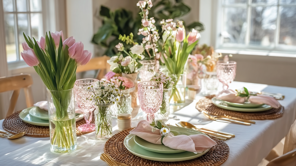 - Цветовая палитра. В 2026 году особенно актуальны нежные пастельные оттенки: пудровый, лавандовый, фисташковый, а также классическая весенняя зелень и белый. Если вам ближе яркие акценты, добавьте сочный розовый, солнечный желтый или терракотовый. Важно, чтобы цвета гармонировали с общим колоритом комнаты. Например, если ваш интерьер выполнен в спокойных тонах, яркая сервировка станет идеальным праздничным акцентом.