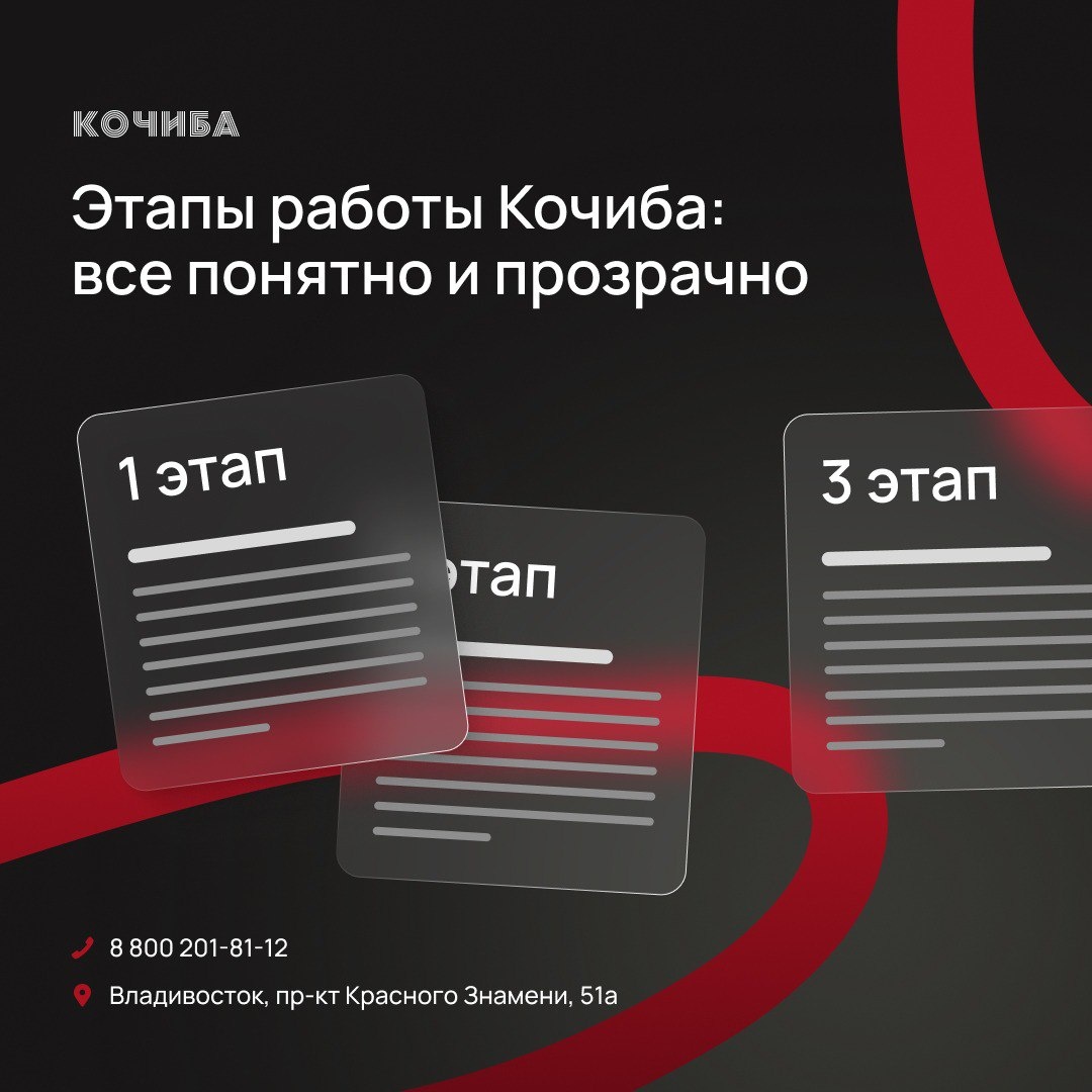 ? У нас нет каких скрытых этапов, все просто: ➽ Заявка Наш менеджер подберет для вас подходящие варианты автомобилей и отправит подборку с конечными ценами во Владивостоке. ➽ Договор После согласования, предоплата по договору перечисляется на расчетный счет компании или в кассу нашего офиса. ➽ Подбор авто Мы подбираем наиболее подходящие автомобили, полностью соответствующие вашему запросу. ➽ Покупка авто Оплата производится за выбранный автомобиль с учетом доставки во Владивосток. ➽ Доставка в Россию После оформления, предоплата за доставку также поступает на расчетный счет или в кассу. ➽ Получение авто Когда все этапы завершены, вы сможете забрать ваш новый автомобиль с бесплатной стоянки во Владивостоке. Покупка автомобиля с нами — это просто и удобно! Начните с заявки, напишите нашему менеджеру