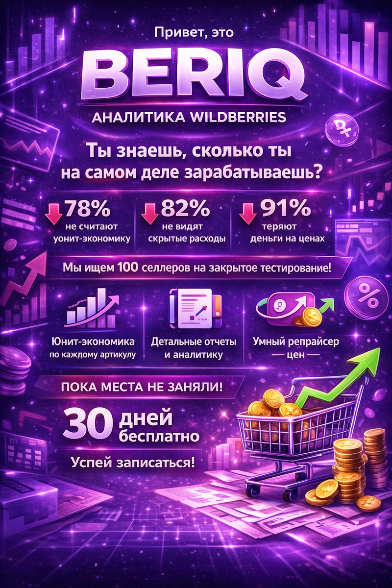 Привет, это BERIQ аналитика Wildberries. Давай честно: ты действительно знаешь, сколько зарабатываешь на каждом конкретном артикуле? Не "в среднем по больнице", а по каждой позиции? Мы опросили 500 селлеров и получили шокирующие цифры: 📉 78% не считают юнит-экономику по каждому товару