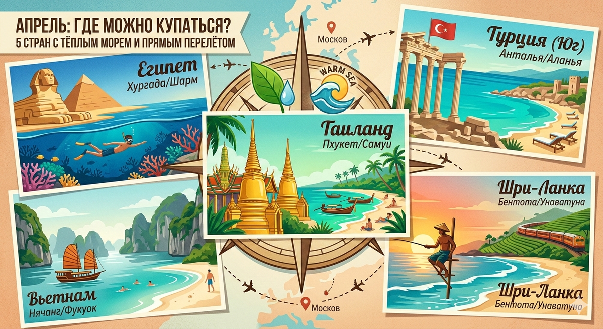 Апрель 2026 года складывается нестандартно. ОАЭ временно выпадают из игры из-за конфликта вокруг Ирана. Куба — под огромным вопросом из-за американского давления и нехватки авиатоплива. Зато Таиланд, Вьетнам, Египет (при благоприятном развитии событий) и Хайнань дают отличные возможности для пляжного отдыха с прямыми рейсами.