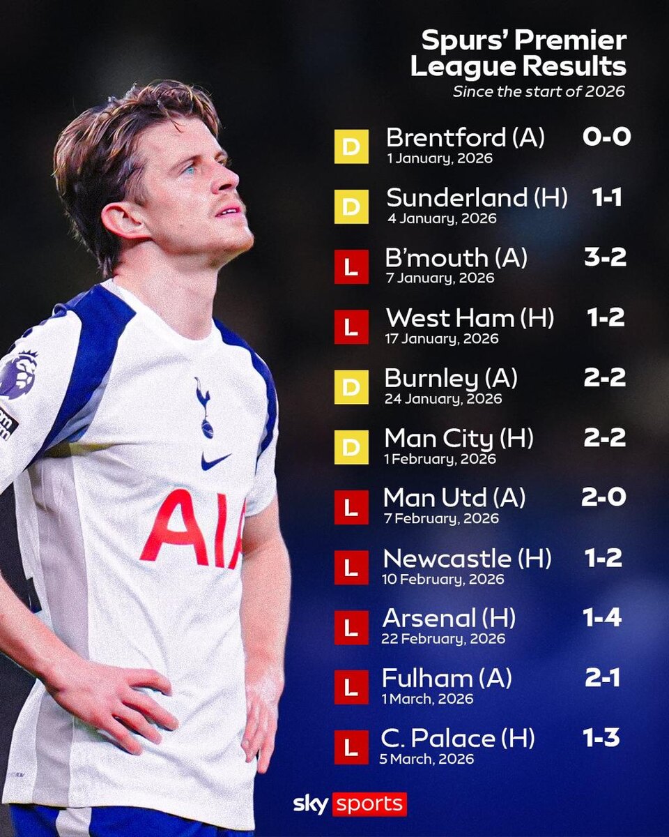 Форма "Тоттенхэма" в 2026 году: 11 матчей, ни одной победы 😬