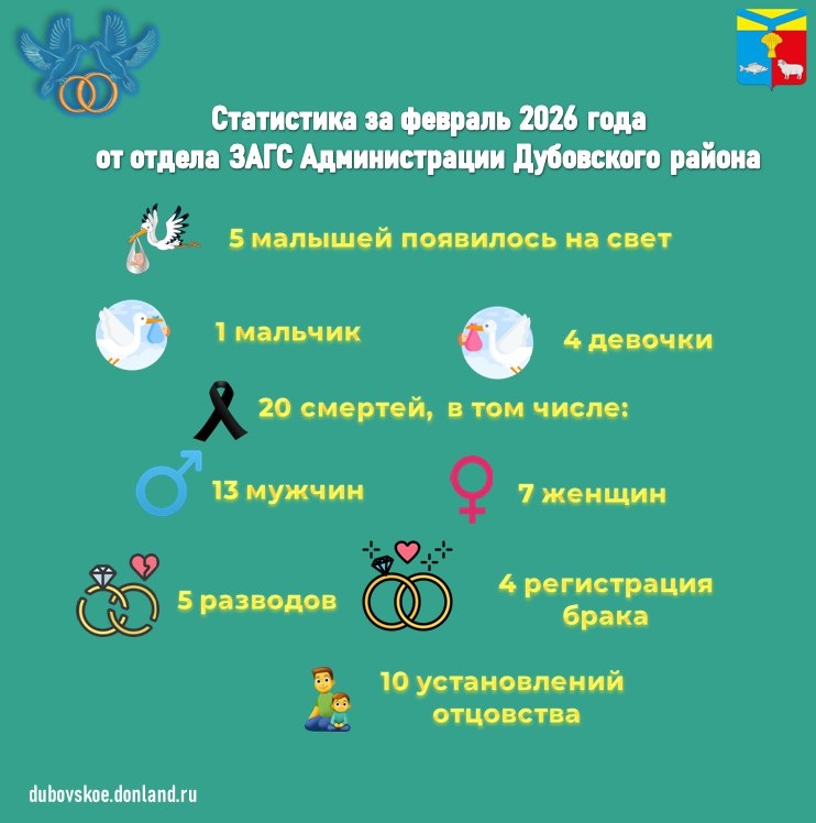В феврале 2026 года Отделом ЗАГС Администрации Дубовского района зарегистрировано 44 акта гражданского состояния