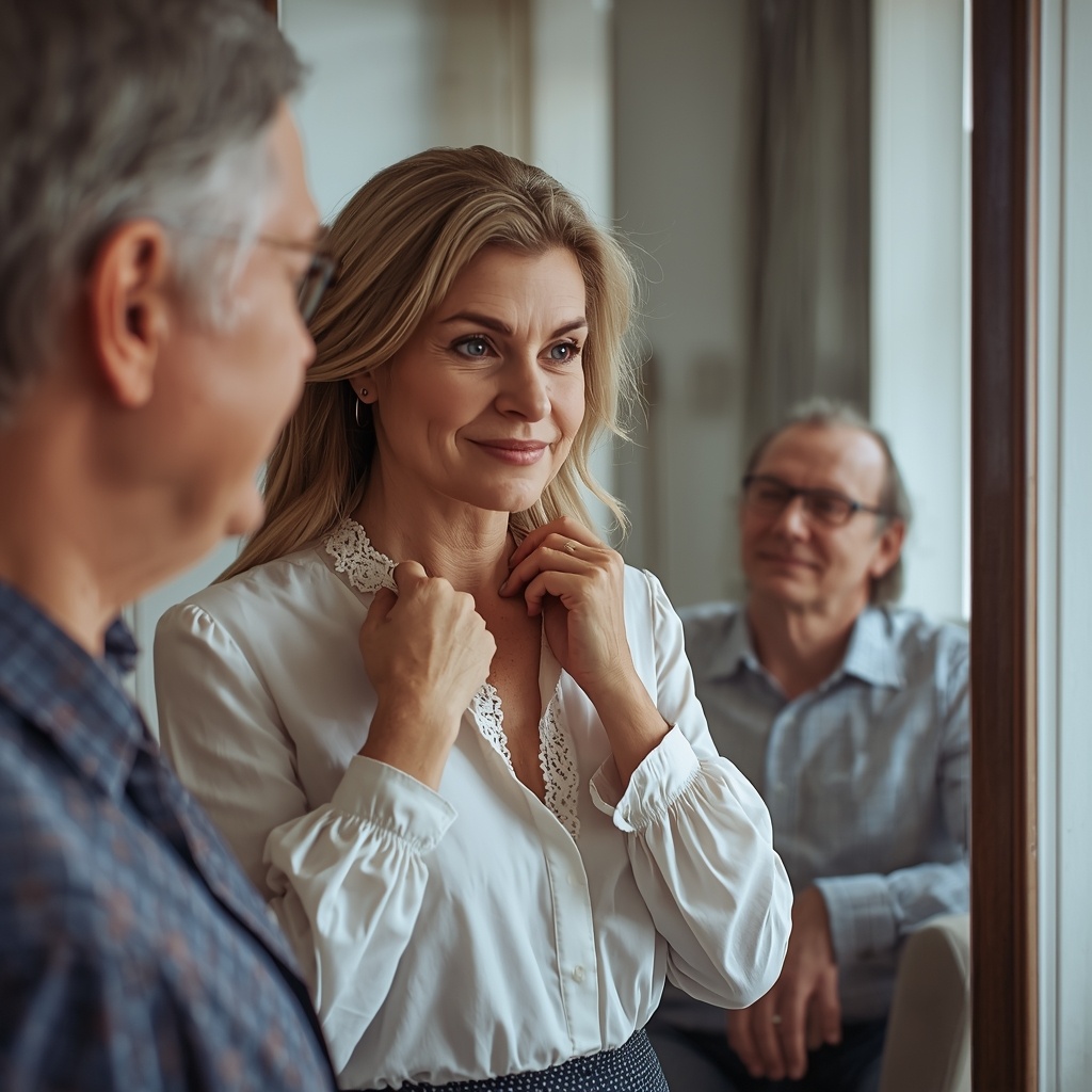 Марина застыла у зеркала в прихожей, поправляя воротничок новой блузки. Белая, с кружевной отделкой по вырезу – она долго выбирала её в магазине, примеряла несколько раз. Сергей сидел в кресле с газетой и наблюдал за ней поверх очков. Его взгляд скользил по её фигуре, задерживался на талии, поднимался выше. Марина чувствовала этот взгляд кожей и невольно выпрямила спину, втянула живот.