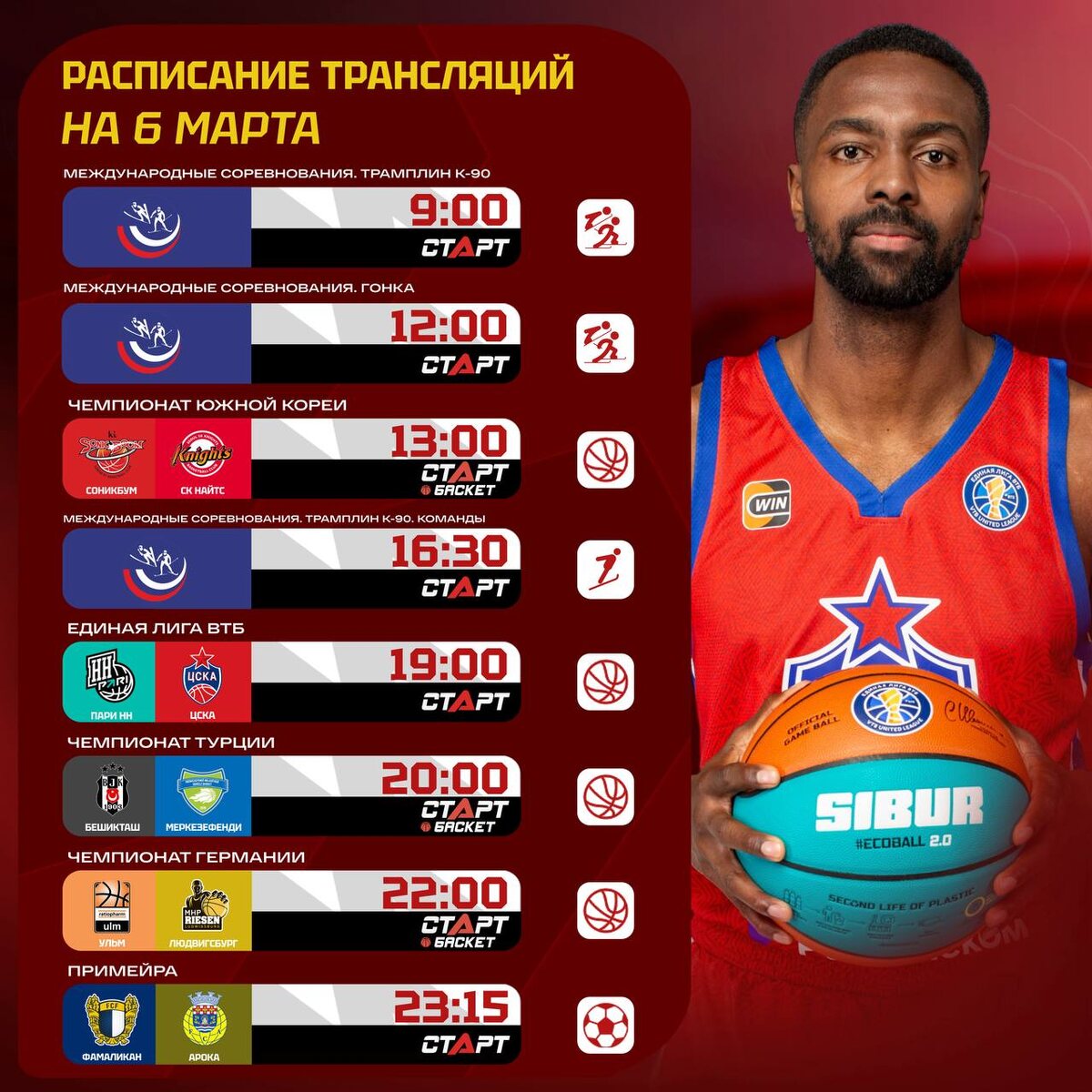 ! Сегодня начнем с горных лыж. А днём — всегда увлекательный корейский баскетбол! Вечер освободите под европейский баскетбол или футбол. Тут каждому свое 🤗 Подписывайся на ТВ СТАРТ в MAX📲