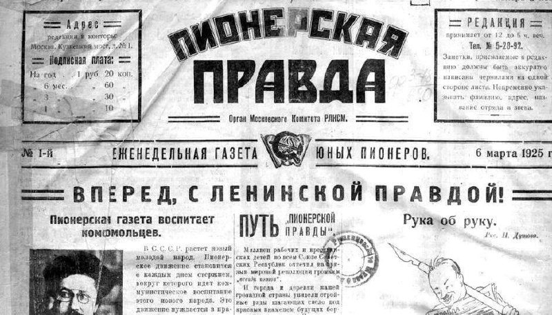 " 😃 6 марта 1925 года вышел первый номер "Пионерки". Всесоюзная детская газета была основана в СССР как еженедельная газета для юных пионеров. 😃 В сложных социальных и экономических условиях после гражданской войны новая газета начинала буквально с двух стульев и одной пишущей машинки которую подарила журналистам сестра В.И. Ленина – Мария Ильинична Ульянова. 😃 Интерес к газете был большим, и её тираж рос стремительно – с 20 тысяч экземпляров в первые годы до 9,5 миллионов к 1975 году. 😃 В создании и дальнейшем развитии «Пионерской правды» принимали активное участие ведущие советские общественные деятели, известные писатели и поэты, среди которых – Н. Крупская,, М. Горький, В. Маяковский, А. Гайдар, С. Маршак, Л. Кассиль, К. Циолковский и другие. Первым редактором газеты стал расстрелянный позднее Николай Бухарин. 😃 Идеологически «Пионерская правда» была создана, чтобы «помогать пионерской организации и школе в коммунистическом воспитании подрастающего поколения, одновременно