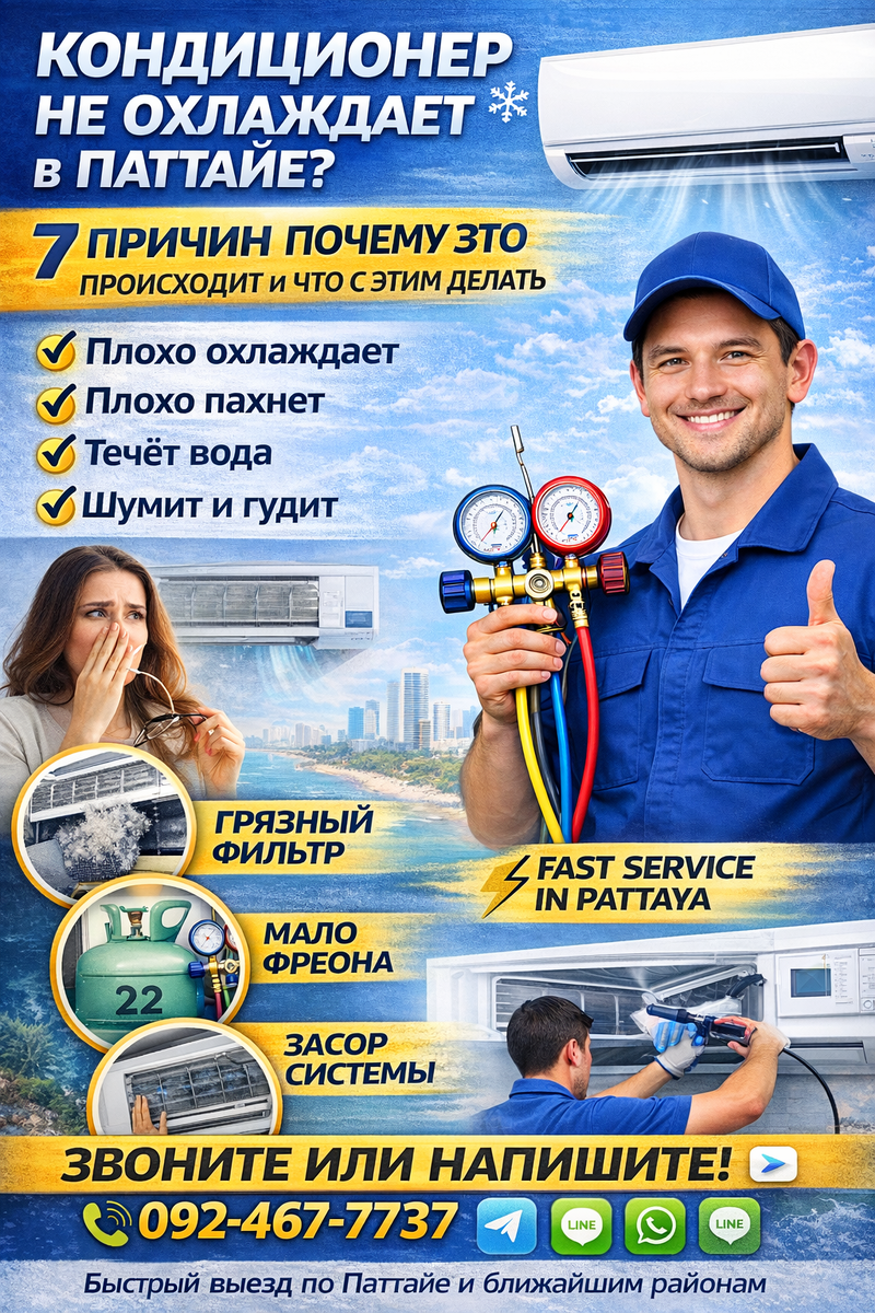 Жизнь в Паттайе невозможно представить без кондиционера. В жарком и влажном климате Таиланда кондиционеры работают практически круглосуточно — в квартирах, кондоминиумах, домах, ресторанах и офисах. Но рано или поздно многие сталкиваются с проблемой: кондиционер начинает хуже охлаждать, появляется неприятный запах, из внутреннего блока начинает течь вода или техника начинает шуметь. Если кондиционер перестал нормально работать, не стоит сразу думать о покупке нового. В большинстве случаев проблему можно решить ремонтом или профессиональным обслуживанием. Разберёмся, какие проблемы возникают чаще всего и почему это происходит. Самая распространённая причина плохого охлаждения — загрязнение внутреннего блока. В условиях тропического климата Паттайи внутри кондиционера быстро накапливаются: — пыль