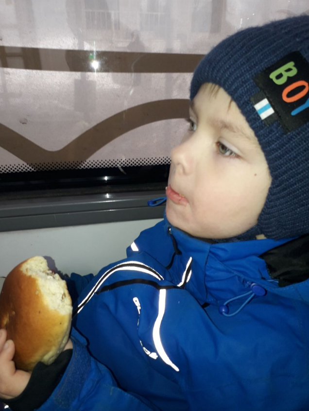 Забрала Мишу и мы поехали на занятия. По дороге купили пирожок. Потому что ребенка я забрала раньше, до полдника и он голодный, ел только в 12 на обед.