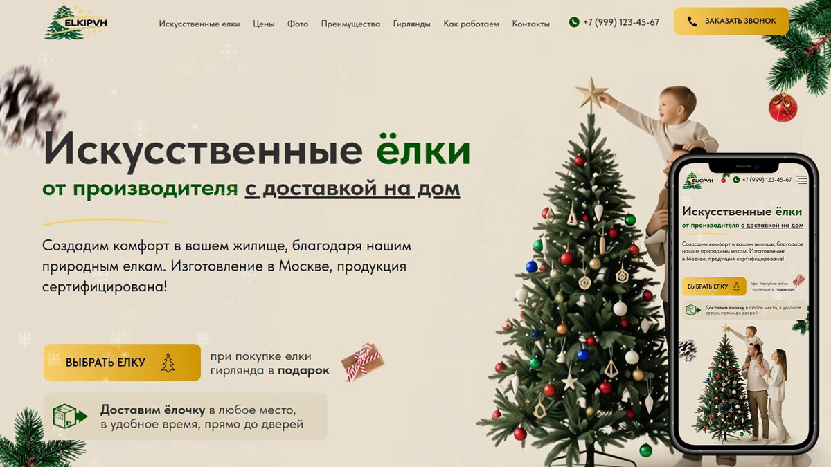 Представляем готовый продающий сайт (шаблон) для бизнеса по продаже искусственных новогодних елей. Разработан специально для производителей, оптовых и розничных компаний, которые хотят представить свою продукцию — от компактных домашних елочек до премиальных уличных композиций высотой от 3 метров. О чем этот сайт: