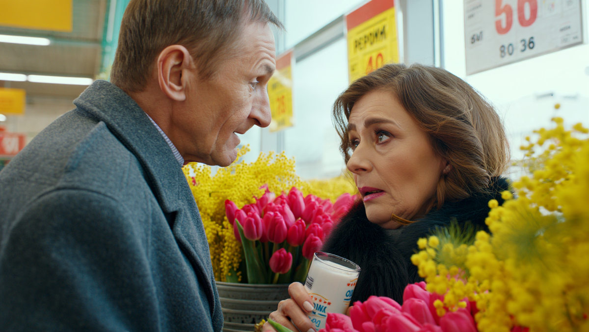У самого входа стояли длинные вёдра с цветами — тюльпаны всех цветов, мимоза, нарциссы. Запах стоял плотный, почти сладкий, голова шла кругом. Люди брали охапками, фотографировали, переспрашивали цену. Я протиснулась, поправила сумку на плече и сразу направилась в молочный отдел — как можно дальше от этой весёлой толпы.