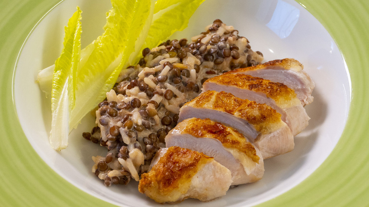 Выложить гарнир на тарелку, сверху — нарезанную грудку + листья салата.