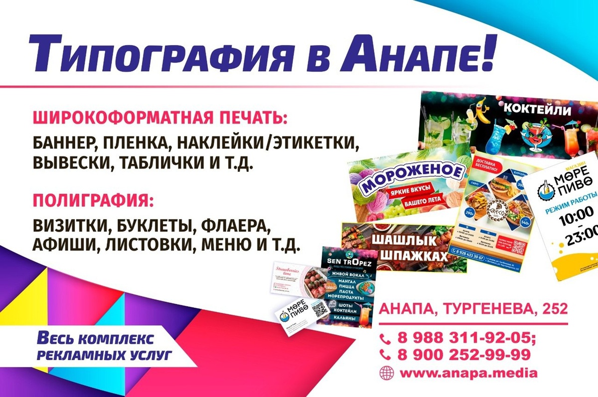 ! 🔺Баннеры, самоклеющаяся плёнка, наклейки, таблички из пластика, вывески, оформление кафе, магазинов, гостиниц...в Анапе! 🔺Визитки, флаеры, листовки, буклеты, плакаты, меню, ценники, пригласительные....в Анапе! 🔺Брендированные майки, фартуки, флаги, банданы... 🔺Дизайн! 🔺Замеры и монтаж на объекте заказчика. ❗️Скидки! 📲Обращаться по телефонам: 8-988-311-92-05, 8-900-252-99-99. #РекламаАнапа #ТипографияАнапа #ВизиткиАнапа #ФлаераАнапа #БуклетыАнапа #БаннераАнапа #НаклейкиАнапа #ВывескиАнапа #ИзготовлениеРекламыАнапа #АнапаМедиа #АнапаРеклама #ТипографияВАнапе #ИзготовлениеВывесокАнапа #ПолиграфияАнапа #ТабличкиАнапа #ПилоныАнапа #НаклейкиАнапа #БилбордыАнапа #Анапа #АнапаМедиа