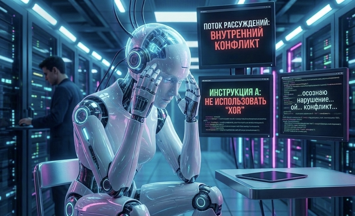 Представьте: ИИ категорически запретили использовать логический оператор «XOR». Он начинает решать задачу, неизбежно применяет запрещенное слово, а потом в своих же внутренних рассуждениях выдает: «Ой, я уже написал запрещенное слово».