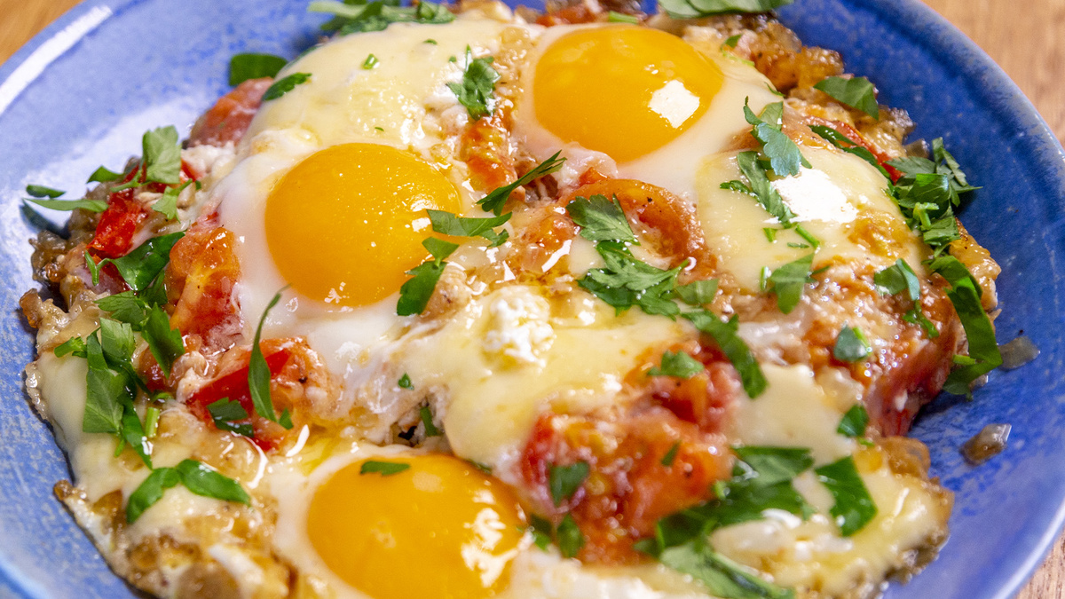Ингредиенты: • Яйца — 3 шт • Лук — ½ шт • Томаты — 2 шт • Сыр — небольшой кусочек • Зелень (петрушка) — 1 пучок • Соль, перец — по вкусу • Раст. масло • Хлеб — 1 кусочек Приготовление: Мелко нарезать лук → обжарить на масле до золотистого цвета. Добавить нарезанные дольками томаты → посолить, поперчить, потушить 2–3 мин. Разбить в сковороду 3 яйца → слегка посолить. Сверху выложить тонкие ломтики сыра + посыпать мелко рубленной петрушкой. Жарить на среднем огне до готовности яиц (сыр расплавится). На отдельной сковороде обжарить хлеб с двух сторон. Выложить яичницу на поджаренный хлеб. Готово за 10 минут — шикарно выглядит и вкусно! Приятного аппетита!