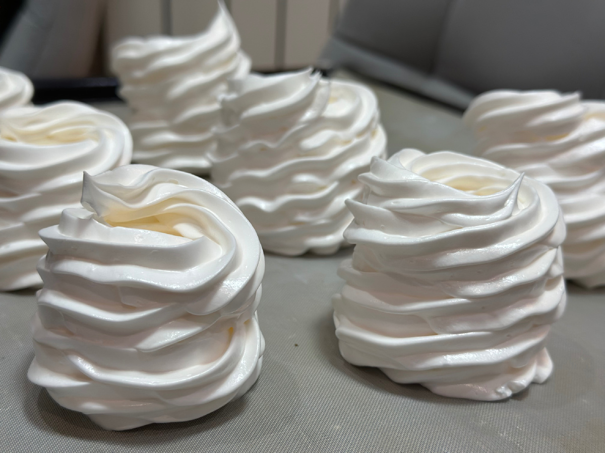 Выкладываем массу в кондитерский мешок с насадкой. Делаем сначала донце, а затем по краю наращиваем второй, третий и т.д. слои.
