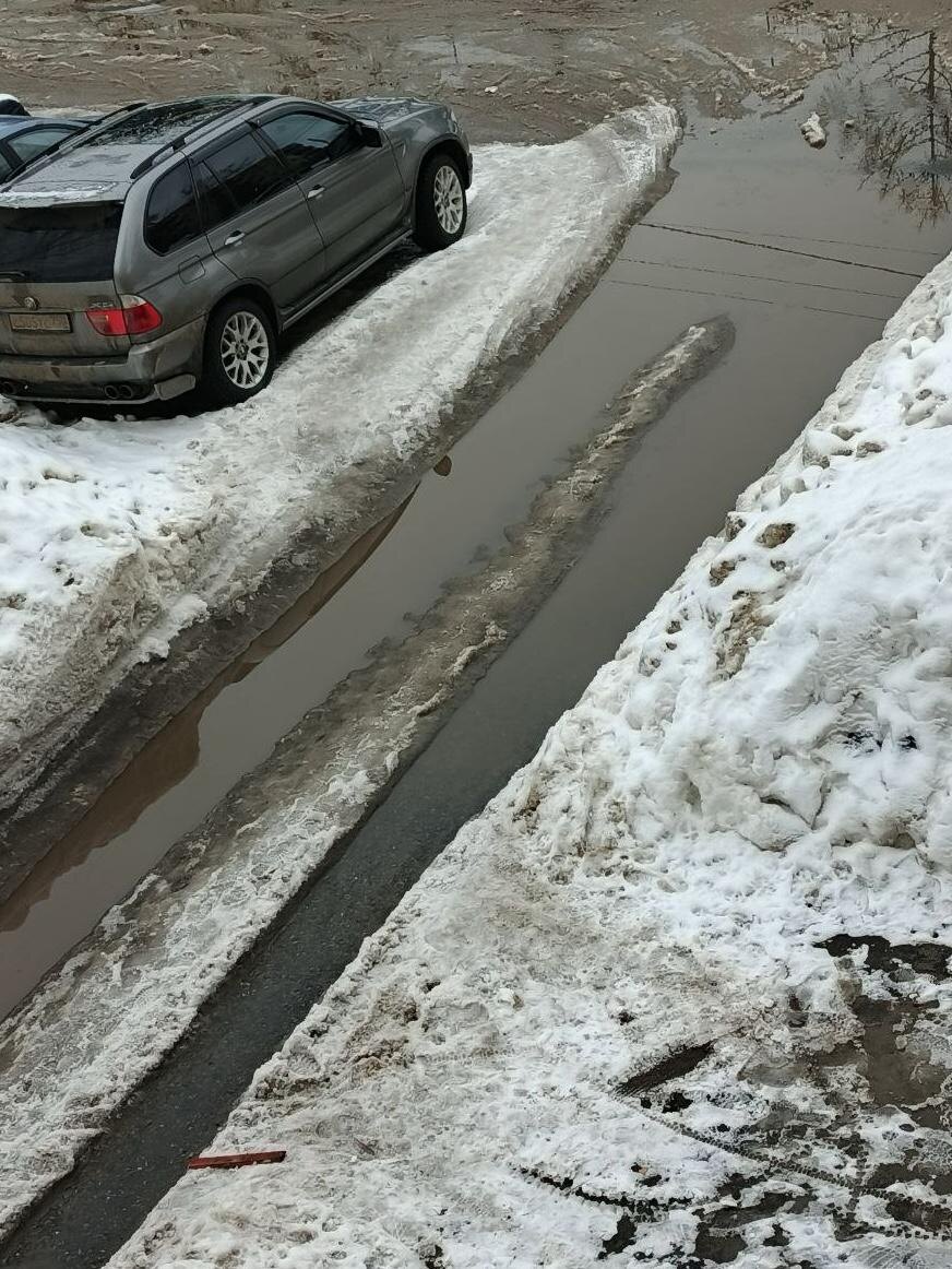 От подъезда выйти и пройти нельзя. Внутри вода и глубоко, а бордюры засыпаны снегом, от воды скользкие. Наступать некуда. Никто не чистит.