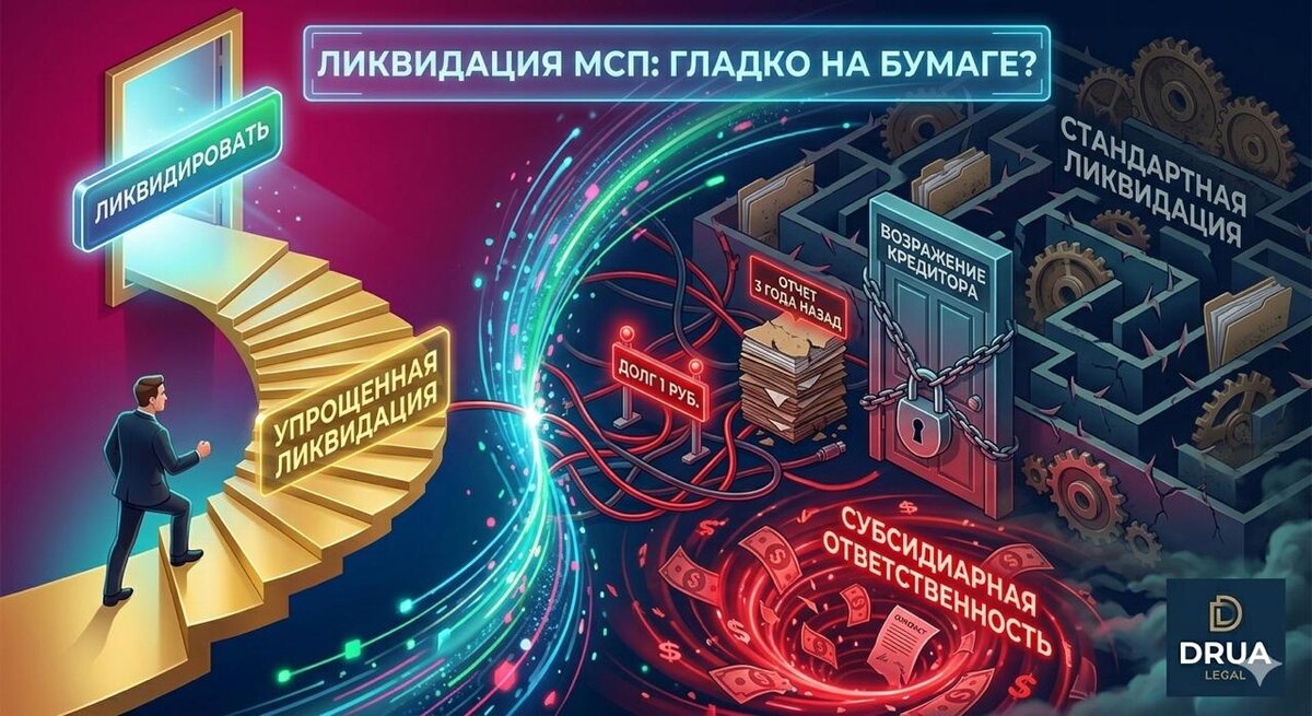 📝 Специальный механизм упрощенной ликвидации для субъектов малого и среднего предпринимательства обещал закрытие бизнеса за 3,5 месяца без выездных проверок и лишней бюрократии. Но практика показала: процедура работает только для кристально чистых компаний. ❌ Если у вас висит долг перед бюджетом хотя бы в 1 рубль, если вы забыли сдать СЗВ-М три года назад или ваш кредитор подал возражение в ЕГРЮЛ в последний день срока – налоговая моментально останавливает ликвидацию. И вам придется начинать стандартную, долгую процедуру через ликвидатора и публикации в «Вестнике». ⏳ Закрыть компанию «нажатием одной кнопки» не получится. Процесс требует тщательной предварительной подготовки и сверки с бюджетом. 🏁 Мы в DRUA Legal проводим полный pre-liquidation аудит. Закрываем долги, снимаем риски субсидиарной ответственности и сопровождаем процесс ликвидации до получения заветной выписки из ЕГРЮЛ. 👉 Хватит копить неработающие юрлица! Напишите aLex – @DRUA_Legal_bot, и мы закроем компанию быстро