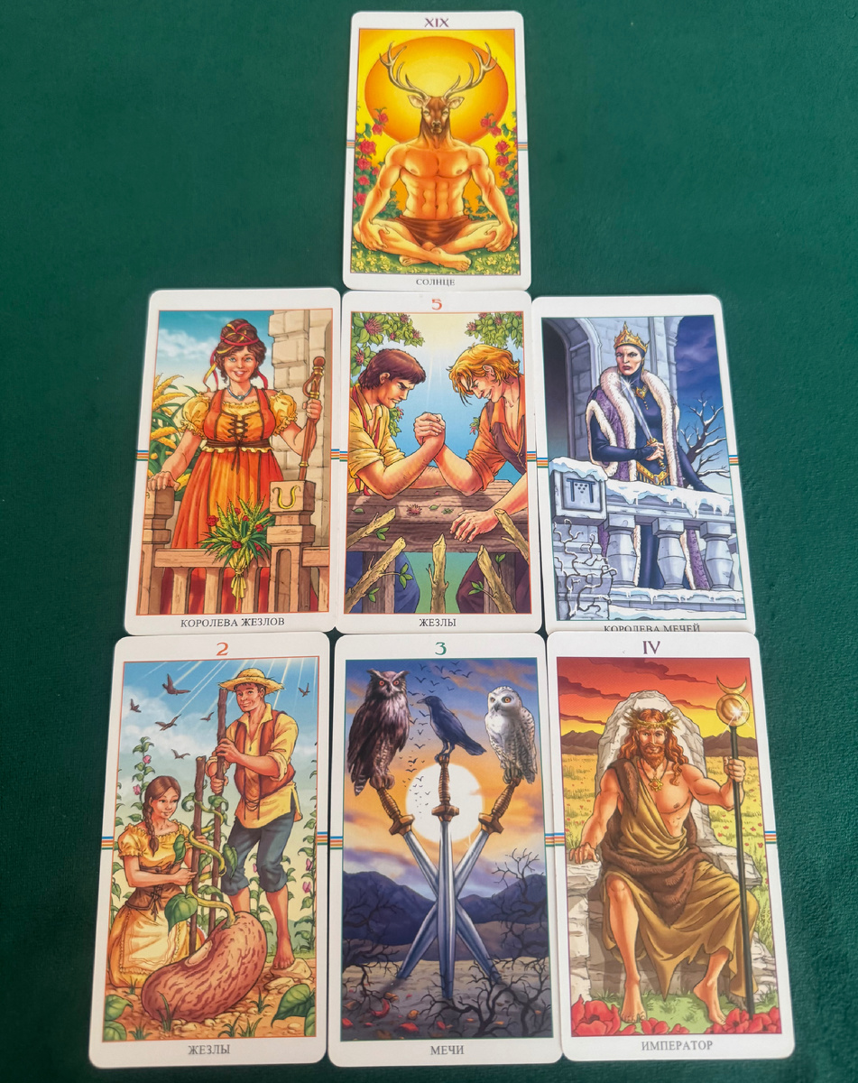 Выкладываю следующие три карты, и они открывают очень интересную картину. Слева у нас легла Королева Жезлов, справа — Королева Мечей, а между ними, в центре, встала Пятерка Жезлов.