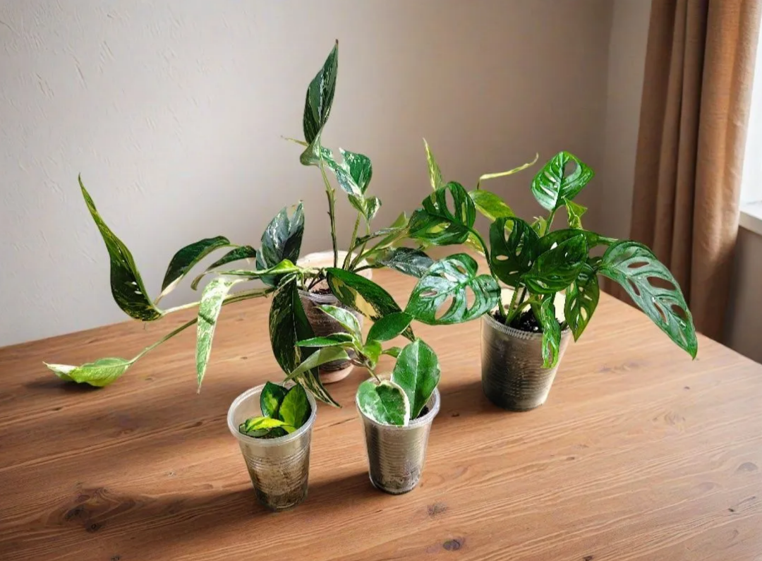 Свои Эпипремнумы я покупала часть неукорененными черенками, а часть черенками в стаканах. Самым последним ко мне прибыл в середине июля 2025г Эпипремнум Пинатум Вайт. При чем часть листьев у него была уже с небольшой перфорацией.