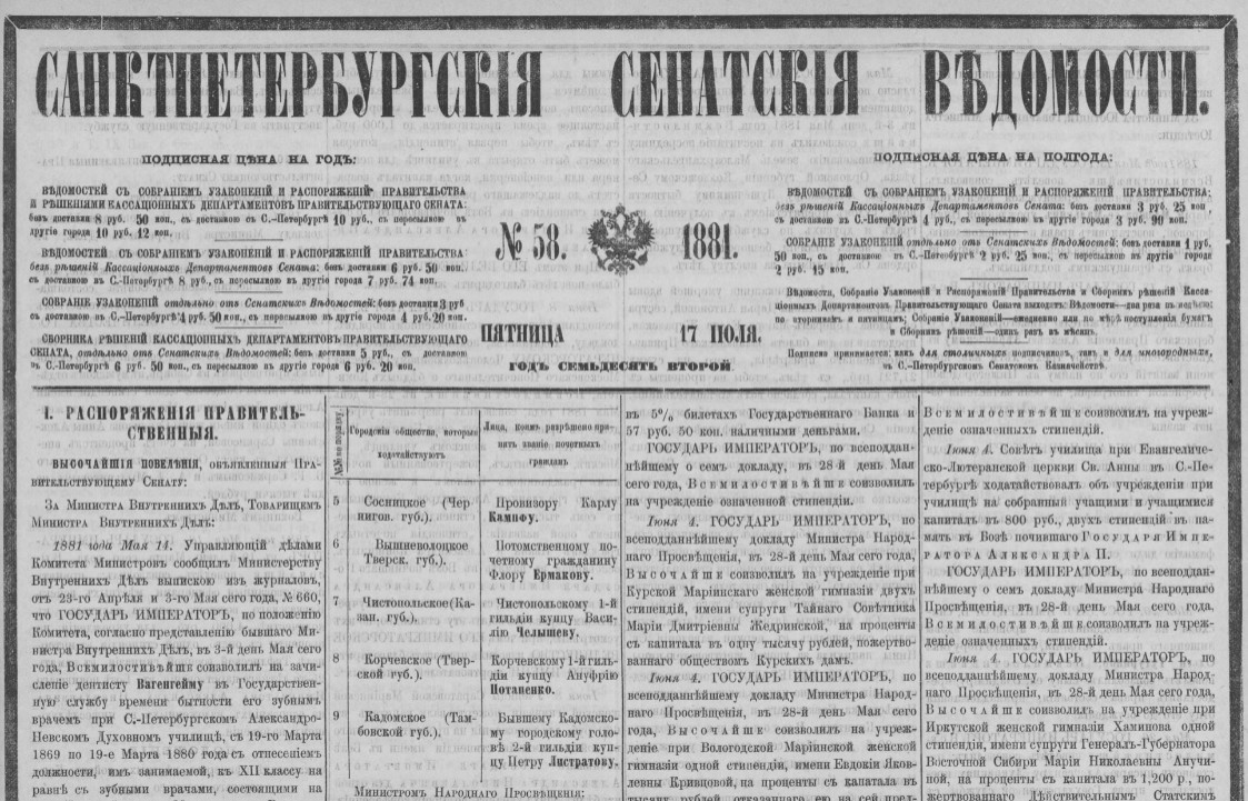 Санкт-Петербургские Сенатские ведомости. № 58, 1881 год 17 июля. Стр. 7 скан. От 2 Июля 1881 года, № 99. По указу ЕГО ИМПЕРАТОРСКАГО ВЕЛИЧЕСТВА, Правительствующий Сенат слушали: представления начальств о производстве, утверждении и переименовании в чины. Приказали: Обнародовать, чрез припечатание указа в Сенатских ведомостях, для сведения и должного, до кого касаться будет, исполнения, что Правительствующим Сенатом: а) Произведены, за выслугу лет, со старшинством: По ведомству Министерства Юстиции. По Казанской губернии. В Надворные Советники Коллежские Ассесоры: Помощники Уездных Исправников: Свияжского - Константин Розенович, с 22 июля 1880 года. https://yandex.ru/archive/catalog/94ea2513-528c-4e77-8030-797702349982/7