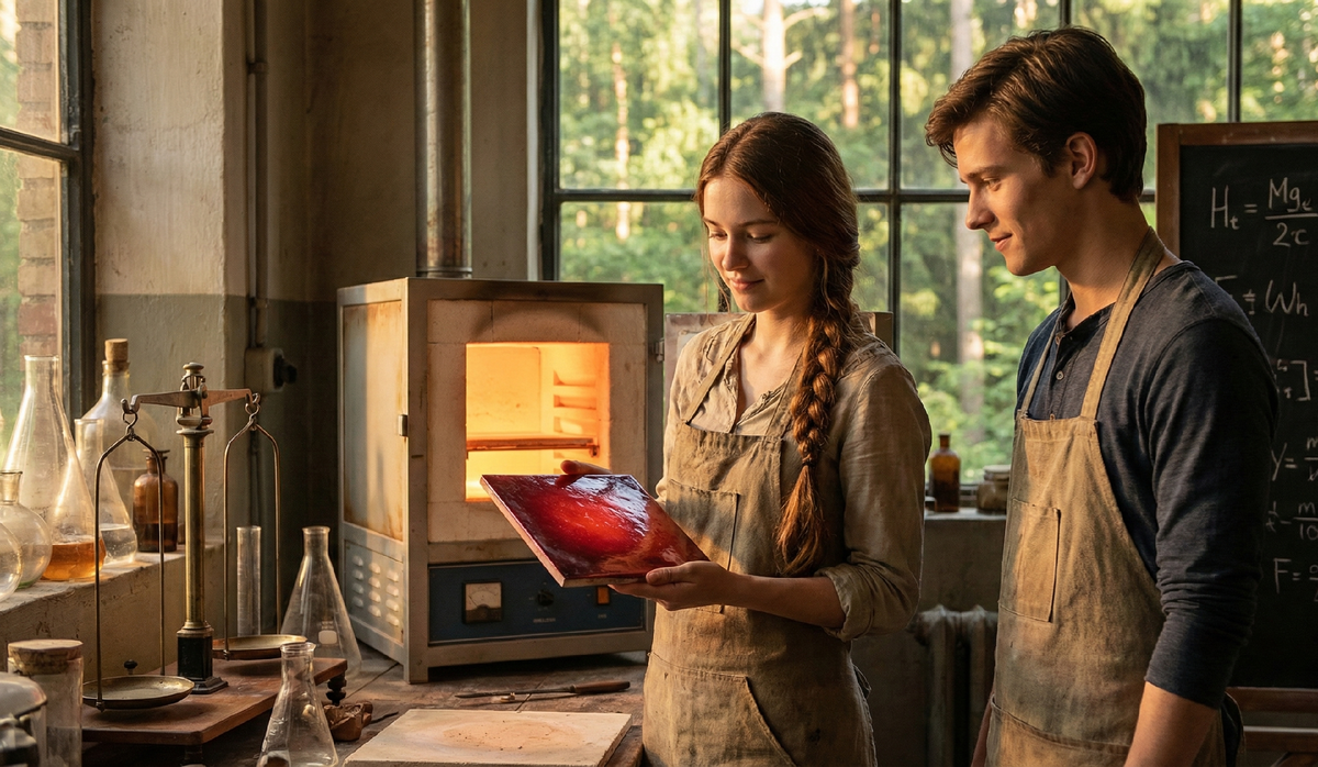Финальный ночной обжиг превратился в их личное таинство. За окном завывал холодный зимний ветер, заметая лесные тропинки, а внутри лаборатории царило уютное тепло. Под ровный гул раскаленной печи, в мягком свете пламени, между ними возникла та глубокая, незримая связь, которая рождается только между близкими по духу людьми. Они сидели рядом, не сводя глаз с датчиков температуры.