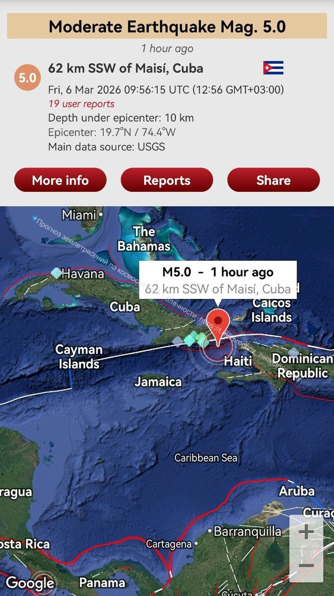 В зоне Карибской плиты возле Кубы произошло умеренное землетрясение М5. Проблема подтверждается, возможно более сильное землетрясение.