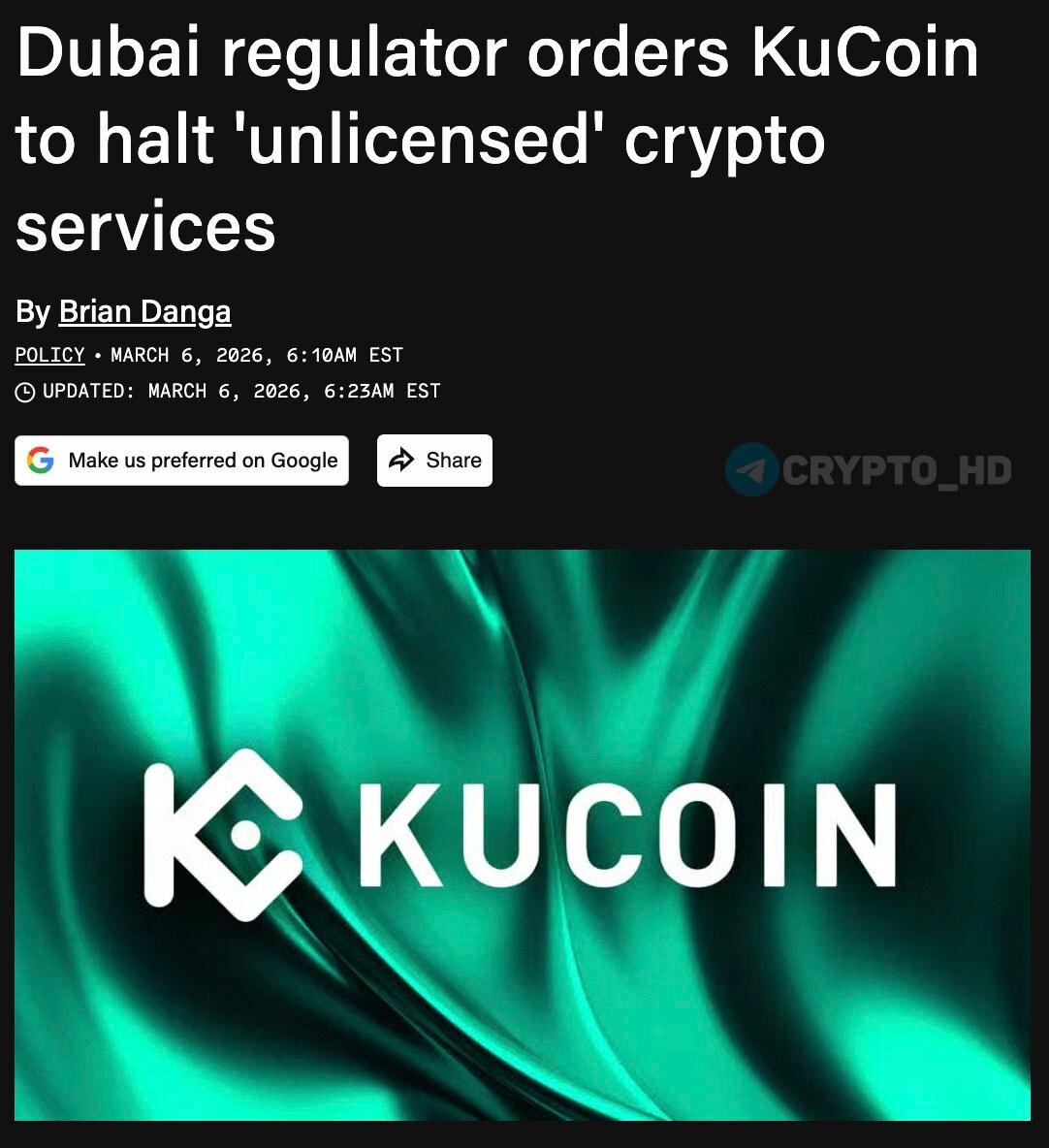 Регулятор виртуальных активов Дубая (VARA) выдал предписание о прекращении деятельности четырем аффилированным структурам KuCoin – биржа работала без лицензии. По заявлению VARA, компания вводила пользователей в заблуждение относительно своего лицензионного статуса. Любая реклама и продвижение услуг биржи в эмирате также не были согласованы с регулятором. Ранее: канадский регулятор Crypto Headlines