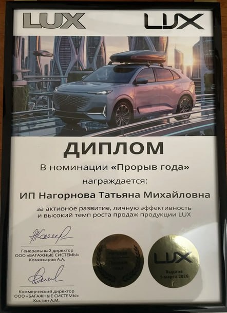 Мы всегда знали, что работаем на совесть, но когда твои успехи подтверждают на федеральном уровне - это вдвойне приятно! С гордостью сообщаем, что наш магазин удостоен сразу двух наград от компании LUX: 🏆 Диплом «Лидер года ЦФО» - за выдающиеся достижения и самый высокий уровень продаж в Центральном федеральном округе. 🔥 Диплом «Прорыв года» - за личную эффективность и высокий темп роста. Эти награды - заслуга нашего общего дела. Спасибо, что выбираете нас и доверяете нам свой комфорт! 🤝 А наш принцип прост: «Покупайте у Лидера! Будь лидером!» Приезжайте за качественными боксами и багажниками к лидерам продаж!