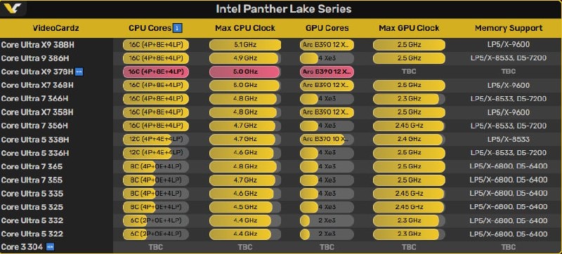 Core Ultra X9 378H получил 16 ядер (4P+8E+4LP), частоту до 5 ГГц и графику Arc B390 с 12 ядрами Xe2, но без поддержки vPro. Появление X9 378H усложняет и без того запутанную систему наименований Intel, где рядом существуют X7 368H и X9 388H с близкими характеристиками. А в линейке Wildcat Lake появилась бюджетная модель Core 3 304, относящаяся к серии Core 300. Характеристики процессора пока не раскрыты.