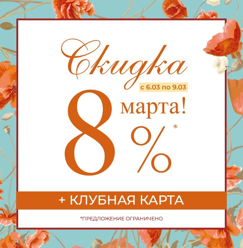 Только с 06 по 09 марта дарим праздничную скидку +8% к вашей клубной карте