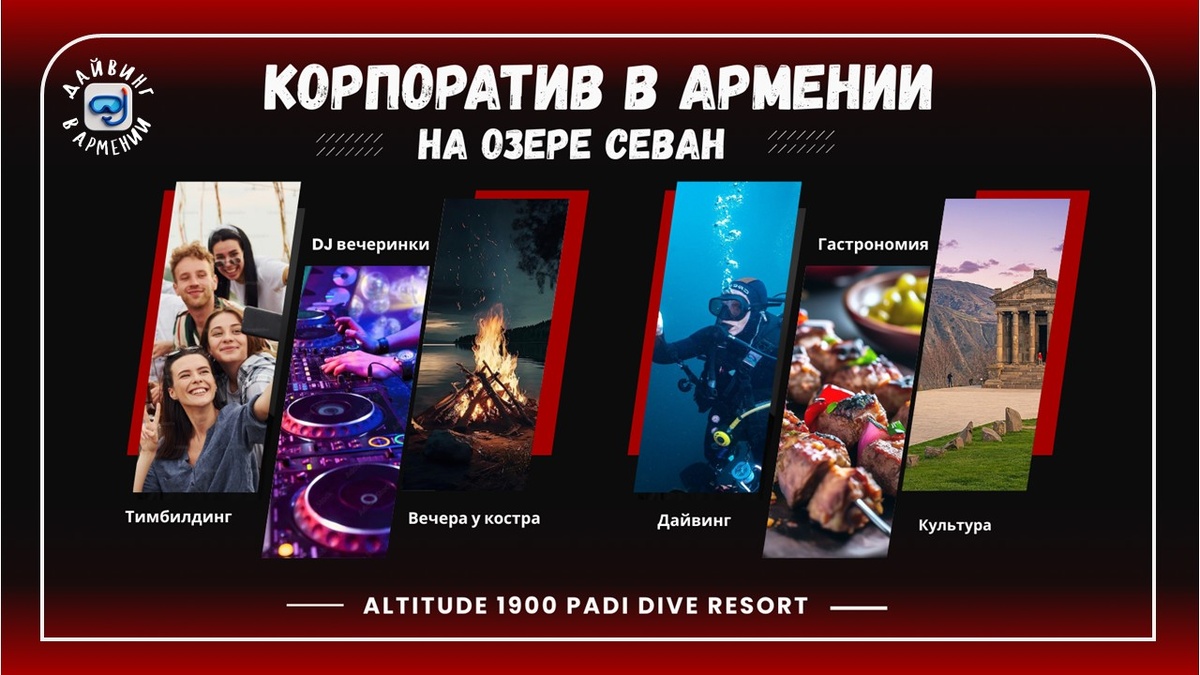 Altitude 1900 PADI Dive Resort— уникальный курорт на берегу озера Севан , где сочетаются: 2. Варианты проведения мероприятий 3. Размещение 4. Тимбилдинговые активности А. Водные развлечения Б. Наземные активности В. Экологический блок «Спасибо, Севан» 5. Вечерние программы 6. Коворкинг 7. Питание и бар 8. Wellness‑зона 9. Экскурсии (опционально) 10. Логистика 11. Пакеты Базовый пакет (однодневный выезд): Пакет «Выходные»(суббота–воскресенье): Полный пакет (многодневный): Доп. услуги: 12. Преимущества для компаний 13. Как заказать