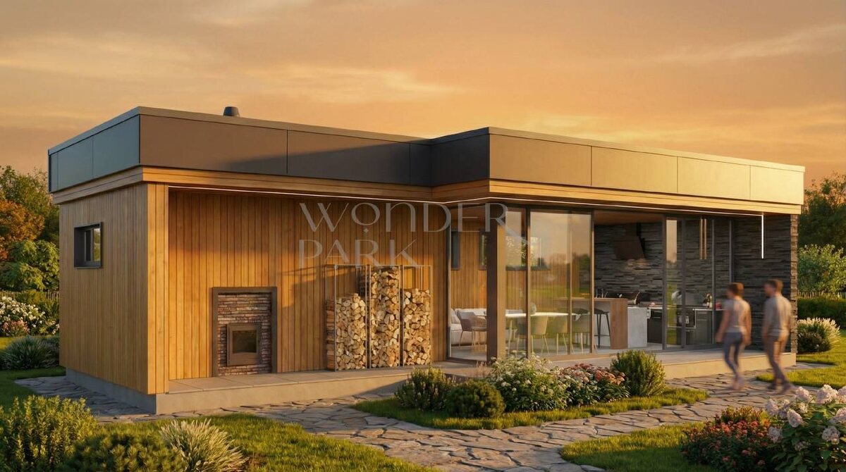 Современная баня с зоной отдыха и барбекю — стильное и продуманное решение для загородного участка. Лаконичная плоская кровля и плавный переход потолка с улицы в интерьер создают эффект единого пространства и подчёркивают современную архитектуру. Планировка включает «тёплый» блок с парной, душевой и с/у, а также просторную зону отдыха 30 м² с кухней и барбекю. Панорамная раздвижная система объединяет гостиную и террасу, превращая её в открытую летнюю веранду. Топка печи вынесена на террасу — в парной всегда чисто и комфортно. Надёжный конструктив, качественное утепление и фасад из лиственницы обеспечивают долговечность и уют в любое время года. Мы строим: