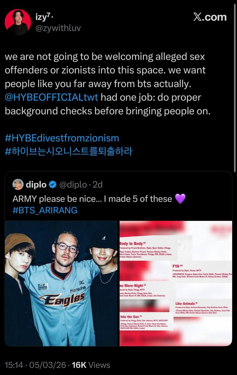 Они заявили, что не хотят видеть рядом с BTS людей с сомнительной репутацией и не собираются "приветствовать предполагаемых сексуальных преступников или сионистов" в этом пространстве. Также фанаты раскритиковали Hybe, отметив, что компания должна проводить тщательную проверку людей перед сотрудничеством. @skandalbomb