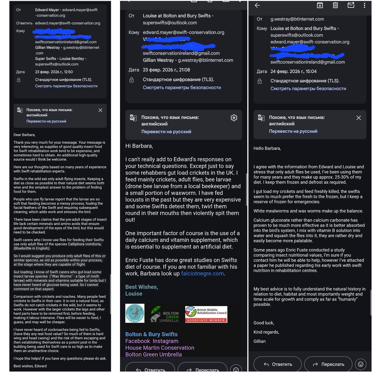 В моей переписке — лидеры британских организаций по спасению стрижей: Эдвард Майер (Edward Mayer) из Swift Conservation, Луиза Уэйкэм (Louise Wakeham) из Bolton & Bury Swifts и Джиллиан Уэстрей (Gillian Westray) — признанный