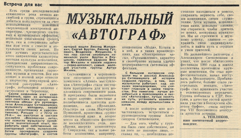 Есть среди последователей «тяжелого» рока немало ансамблей и групп, стремящихся добиться популярности за счет использования новейшей сверхмощной электронной аппаратуры, чрезмерных световых и музыкальных эффектов, поднимая ужасающий грохот, шум, гам и совершенно забывая при этом о смысле и актуальности своих песен. Но для лучших представителей этого направления характерны высокая культура исполнения, гражданская направленность, созвучность проблемам современности, органичная гармония музыки и текстов. Все это можно в полной мере отнести к творчеству популярной московской рок-группы «Автограф», побывавшей недавно с гастролями в Череповце. Своим созданием этот своеобразный, один из интереснейших советских эстрадных коллективов обязан его руководителю Александру Ситковецкому, музыканту молодому, несомненно талантливому и перспективному. Раньше — с 72-го по 79-й — он выступал в составе ансамбля «Високосное лето», что помогло музыканту приобрести значительный опыт, выработать свой собственны