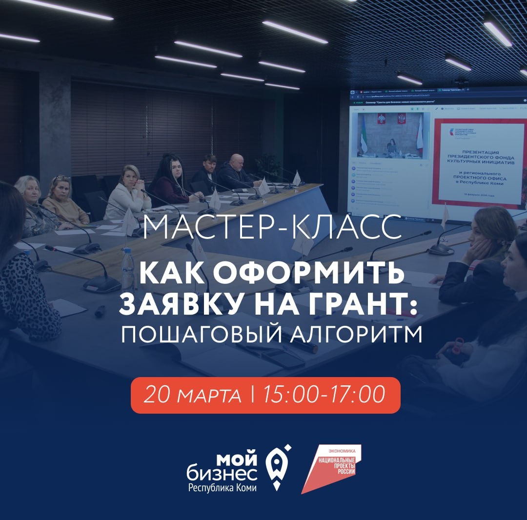 20 марта в Центре «Мой бизнес» Коми пройдёт практический мастер-класс «Как оформить заявку на грант: пошаговый алгоритм». Это встреча для предпринимателей и всех, кто только планирует начать своё дело. Приходите, если хотите реально повысить шанс на получение финансирования. На мастер-классе увидим грантовую заявку «глазами эксперта» и узнаем: 🔹 как правильно сформулировать проблему и определить целевую аудиторию 🔹как выстроить логику: цель, задачи и план мероприятий 🔹 какие результаты нужно закладывать в заявку 🔹как составить обоснованный бюджет 🔹по каким критериям эксперты оценивают заявку и принимают решения 🔹типичные ошибки, из-за которых проекты не получают поддержку Спикер — Елена Рассыхаева, директор филиала Российское общество «Знание» в Республике Коми. Является экспертом конкурсов Росмолодёжь.Гранты, #МЫВМЕСТЕ и «Твой ход», по этому регулярно видит сотни заявок и знает, по каким принципам они оцениваются. Формат участия: очный или дистанционный. ➡️ Обязательна рег