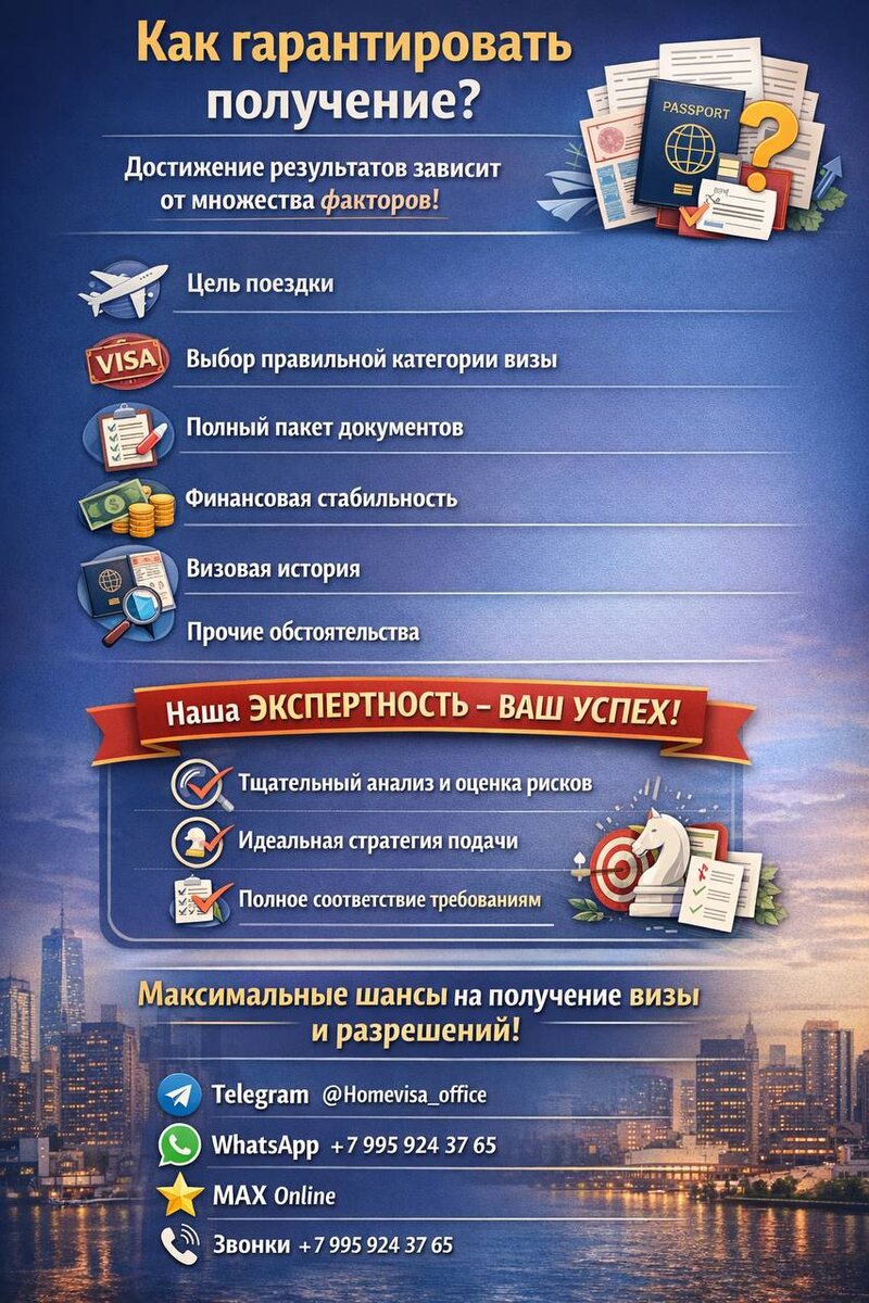 Как гарантировать получение? Гарантировать получение в прямом смысле слова нельзя. Подача на любую визовую программу и оформление документов — это комплекс мероприятий, результат которого зависит от большого количества факторов. На итоговое решение влияют: • цели поездки; • корректность выбранной категории визы; • полнота и качество пакета документов; • финансовая устойчивость заявителя; • соответствие требованиям страны; • визовая история; • и ряд других обстоятельств. Однако важно понимать: чем более детально, структурированно и надёжно подготовлен кейс, тем выше вероятность положительного результата. Грамотный анализ рисков, правильно выбранная стратегия подачи и точное соответствие требованиям страны существенно повышают вероятность получения визы или другого разрешительного документа. Как с нами связаться 🌙 Telegram https://t.me/Homevisa_office 💻 WhatsApp https://wa.me/+79959243765 ⭐ MAX https://clck.ru/3SDbvG 🏠 Телефон +79959243765