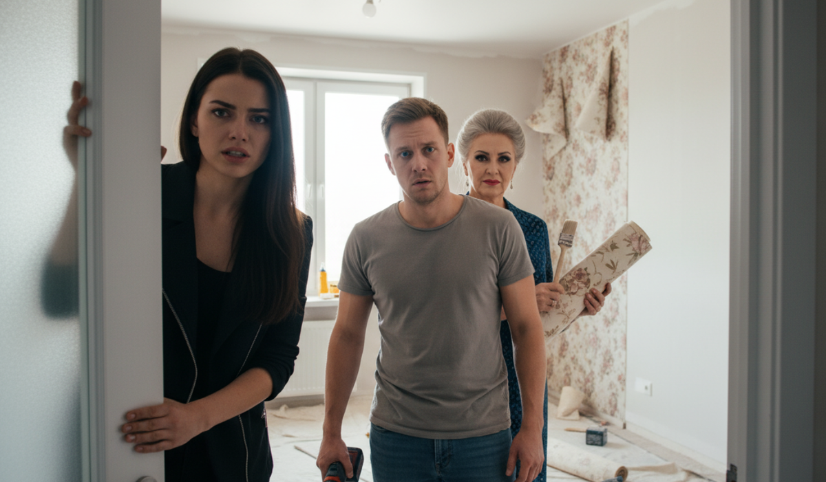 Свекровь стояла посреди комнаты. В руках — кисточка, у ног — рулоны обоев в мелкий цветочный орнамент. На стене — ободранный угол, осыпавшаяся штукатурка. Рядом стоял Игорь с дрелью.