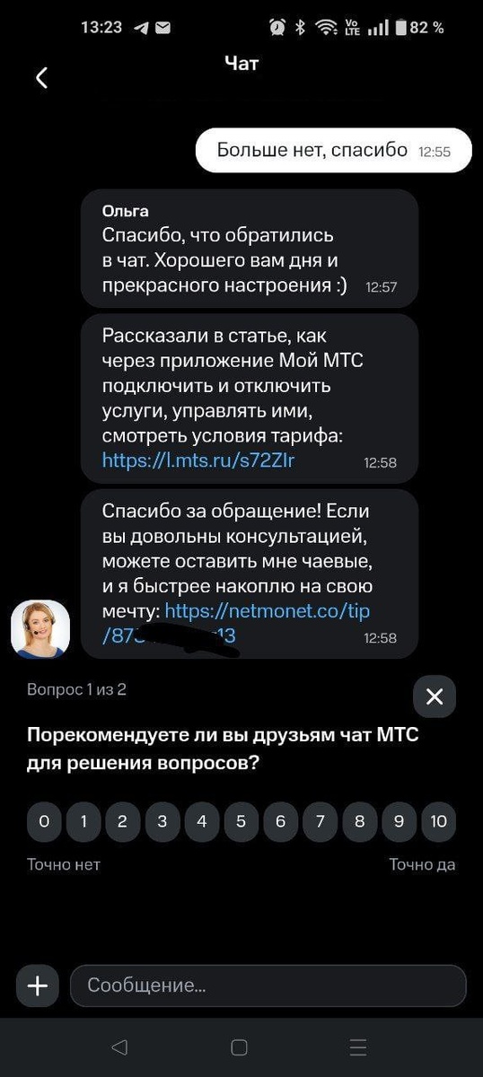 МТС теперь предлагает оставить чаевые оператору поддержки после консультации