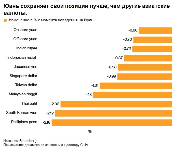 Китайские рынки показали себя лучше, чем рынки других азиатских стран, во время глобального обвала, вызванного войной в Иране.На внутреннем рынке акции упали примерно на 1% на этой неделе, в то время как на азиатских рынках снижение превысило 6%, а юань показал наименьшее падение по отношению к доллару среди основных азиатских валют. Китайские рынки продемонстрировали устойчивость во время глобального обвала, связанного с войной в Иране. На этой неделе внутренние акции снизились примерно на 1%, в то время как акции азиатских стран потеряли более 6%. Несмотря на предупреждения аналитиков о возможном влиянии конфликта на регион, включая Китай, который является крупным импортером нефти, юань показал наименьшее падение по сравнению с другими основными азиатскими валютами. Государственные облигации Китая также оказались более устойчивыми по сравнению с аналогичными инструментами других стран, на фоне общей распродажи на рынках. В условиях нарастающих геополитических рисков и волатильности н