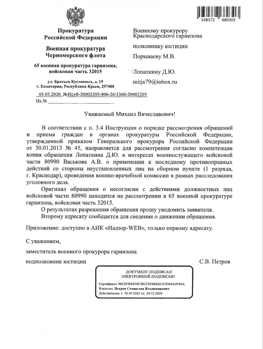 Иногда в юридической практике приходится вмешиваться в ситуации, требующие особого контроля. Слава Богу, такие случаи происходят не каждый день, но именно по таким острым вопросам люди чаще всего и обращаются за помощью. На фото — ответ из 65 военной прокуратуры гарнизона (г. Евпатория). Суть дела касается защиты интересов военнослужащего А.В. Васькова. Речь идет о серьезных вещах: заявлениях о противоправных действиях на сборном пункте в Краснодаре и необходимости проведения военно-врачебной комиссии (ВВК) в рамках расследования. Важно отметить четкую работу ведомств: 1. Часть обращения, касающаяся должностных лиц воинской части, уже находится на рассмотрении в Евпатории. 2. Материалы по фактам в Краснодаре официально переданы военному прокурору Краснодарского гарнизона полковнику юстиции М.В. Порываеву. Как мы видим, у каждой проблемы, у каждого нарушения есть конкретные фамилия, имя и отчество. Правовой механизм запущен, и теперь слово за надзорными органами. Выражаем надежду, ч