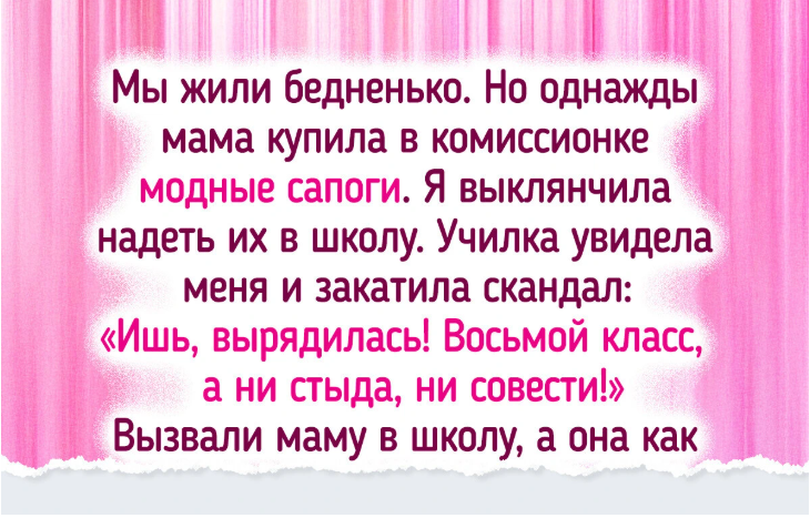 - Мы жили бедненько. Но однажды мама купила в комиссионке модные сапоги. Я выклянчила надеть их в школу. Училка увидела меня и закатила скандал: «Ишь, вырядилась! Восьмой класс, а ни стыда, ни совести!» Вызвали маму в школу, а она как пришла, так сразу и спросила: