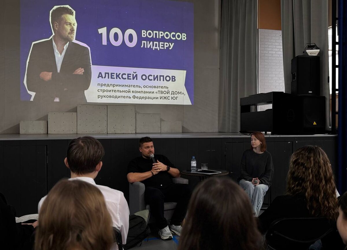 » 🏆 Сегодня в рамках проекта «100 вопросов лидеру» к нам приехал Алексей Осипов — предприниматель, основатель строительной компании «ТВОЙ ДОМ», руководитель Федерации ИЖС ЮГ. 💬 Первый вопрос студентов был именно про мотивацию, а потом разговор завернул туда, где рождаются настоящие смыслы: Мне всегда хотелось создавать то, что поможет людям. За каждым разочарованием всегда идёт победа. Самое сложное — сделать первый шаг. 🧑🎓 Студенты спрашивали про школьные годы (был красавчиком — подтвердили все присутствующие), про важность оценок, про самый сложный проект и про то, как выбрать дело на много лет. Спасибо вам, Алексей, за живой диалог и за то, что напомнили нам: любой большой дома начинается с первого кирпича 💙 #100_вопросов_лидеру