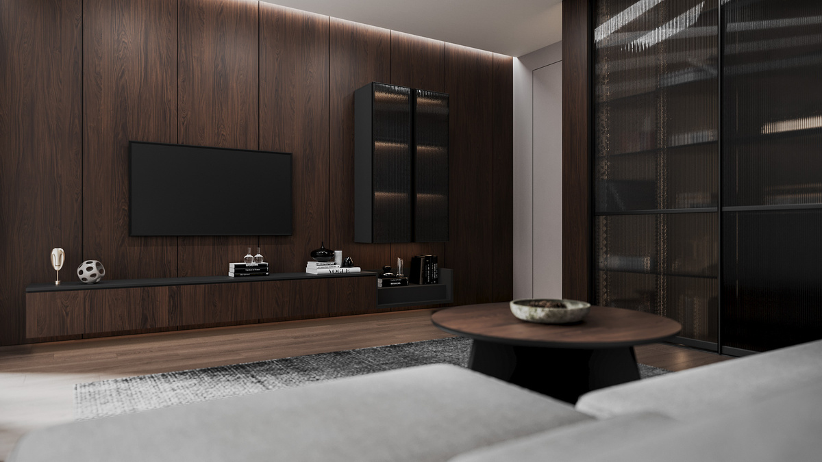 Приобрели мебель, выбрали то, что дороже, а в итоге — все равно чего-то не хватает. Знакомая ситуация? Нет цельности. Нет того ощущения, когда заходишь в комнату и сразу понимаешь: здесь поработали с умом. За годы работы мы заметили закономерность. Статус интерьеру придает не всегда ценник на мебель, а три конкретных решения. Ниже — разбор интерьера гостиной, где три предмета мебели и подход к их дизайну изменили восприятие всего пространства. В центре гостиной — подвесная тумба под телевизор со встроенной подсветкой. Почему подвесная конструкция? Использовали два декора для контраста. Дуб Каселла каштановый пошел на стеновые панели и лицевые части — естественный рисунок годовых колец, матовая поверхность напоминает шпон с масляным покрытием. Диамант серый — для корпуса, бумажно-слоистый пластик полной прокраски без видимых швов. Рядом — навесной пенал с дверями из структурного рифленого стекла в алюминиевых профилях оттенка Графит. Ручки интегрированы в профиль, внутри полок — подсвет