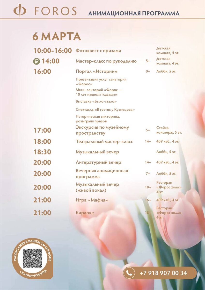 ». Мы подготовили особенную праздничную программу, в которой каждый найдёт событие по душе: творческие мастер-классы, познавательные встречи, занятия для здоровья и гармонии, музыкальные вечера, живой вокал, игры и атмосферные вечерние программы. Днём — забота о себе, развитие и творчество. Вечером — музыка, общение и яркие эмоции. А для юных гостей предусмотрены отдельные активности. 🌷Не пропустите то, что откликнется именно вам! Ознакомьтесь с полной программой мероприятий в афишах, сохраните расписание и проведите праздничные дни вместе с нами. С любовью к вашему отдыху, санаторий «Форос» 💐