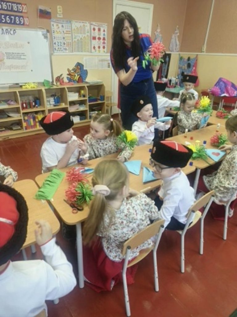 В рамках мастер-класса казачата создавали декоративные изделия в форме цветов, предназначенные для их матерей. В процессе использовались различные материалы, такие как цветная бумага нескольких оттенков, клей-карандаш и ножницы, что позволило детям проявить свою креативность и мелкую моторику. Дети с энтузиазмом включились в процесс, демонстрируя аккуратность и старание при создании каждого элемента композиции. Особое внимание уделялось деталям: лепестки цветов собирались с особой тщательностью, а готовые изделия аккуратно укладывались в корзинки, дополненные разноцветными сердечками с пожеланиями. Атмосфера мероприятия характеризовалась дружелюбием и позитивным настроем, что способствовало активному взаимодействию участников. В процессе работы дети задавали вопросы, делились своими идеями и помогали друг другу, что свидетельствует о высоком уровне их социализации и взаимопомощи. Каждая поделка, созданная в ходе мастер-класса, отличалась уникальностью, так как была выполнена с любовью
