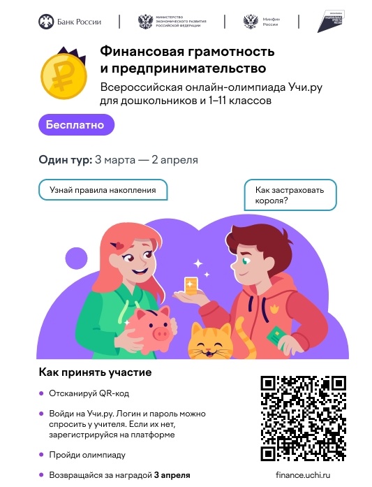С 3 марта по 2 апреля 2026 года на образовательной платформе «Учи.ру» для учеников 1-11 классов пройдет Всероссийская онлайн-олимпиада по финансовой грамотности и предпринимательству, организованная при поддержке Банка России, Минфина России, АНО «Национальные приоритеты» и Минэкономразвития России. Что ждет участников олимпиады?