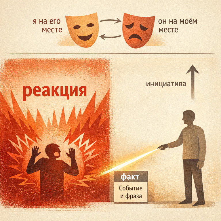 Не потому что грубо. А потому что ты отдал инициативу. Ты перешёл в режим реакции. И теперь другой человек ведёт – а ты просто отвечаешь. Вот где настоящая власть в коммуникации. Не в том, кто громче. А в том, кто удерживает связь с реальными, измеримыми событиями. Пример. Тебе говорят что-то резкое. Ты отвечаешь не на контекст, а на скажем подачу, что то типа: «Не совсем понятно когда разговор в таком тоне стал нормой. И перехватывая инициативу уточняешь: Если бы с тобой разговаривали в таком тоне тебе бы было комфортно? и тд и тп. Это не агрессия. Это перемещение человека в его собственный фрейм. Он начинает видеть свою модель поведения изнутри. И вот тут возможен настоящий разговор. Я называю это «поставить его на своё место» – не в смысле унизить, а буквально: дать ему почувствовать позицию собеседника. Это второй ключевой навык управления смыслом. Первый – уметь поставить себя на его место. Оба нужны. И оба тренируются. Попробуй в следующем разговоре, где чувствуешь давление